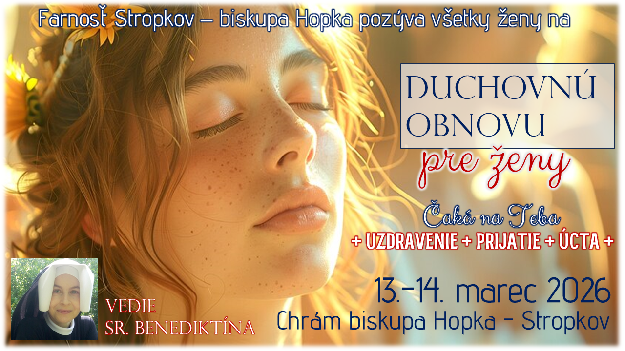 V tomto pôstnom čase pozývame všetky ženy prísť, na chvíľu sa zastaviť a načerpať pokoj, prijatie a úctu od toho, kto pozná tvoje srdce, tvoje rany, túžby a sny. A hlave vie, ako veľmi túžiš byť milovaná. Príď a dovoľ svojmu Bohu aby k tebe mohol hovoriť slová lásky, uistenia a pokoja pre tvoju dušu. Duchovnú obnovu bude viesť sr. Benediktína z Kongregácie sestier Matky Božieho Milosrdenstva.