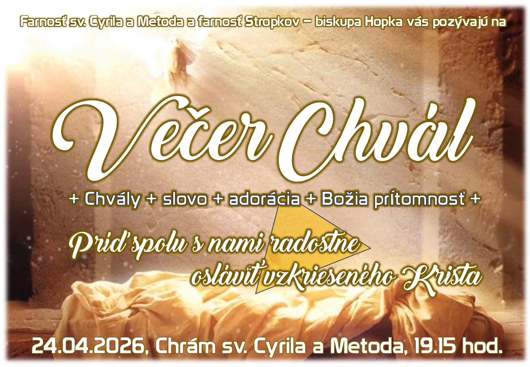 Srdečne vás pozývame prežiť Večer chvál, ktorým chceme radostným spôsobom osláviť vzkrieseného Krista a dovoliť mu, aby moc jeho lásky a zmŕtvychvstania zničila akúkoľvek temnotu a strach v našom živote.