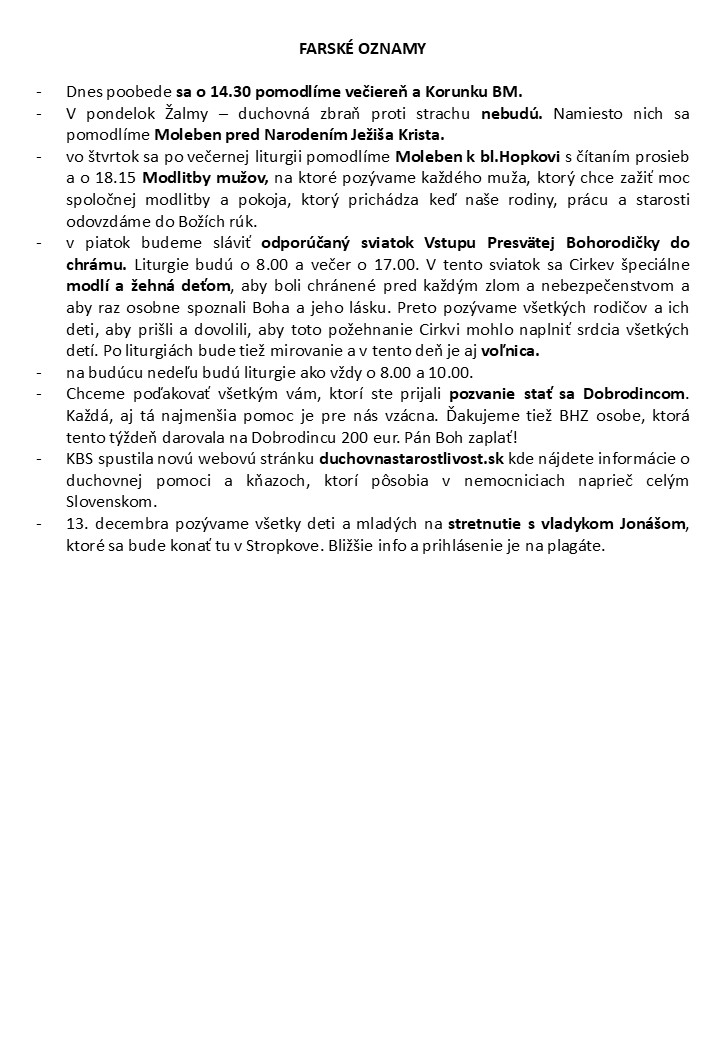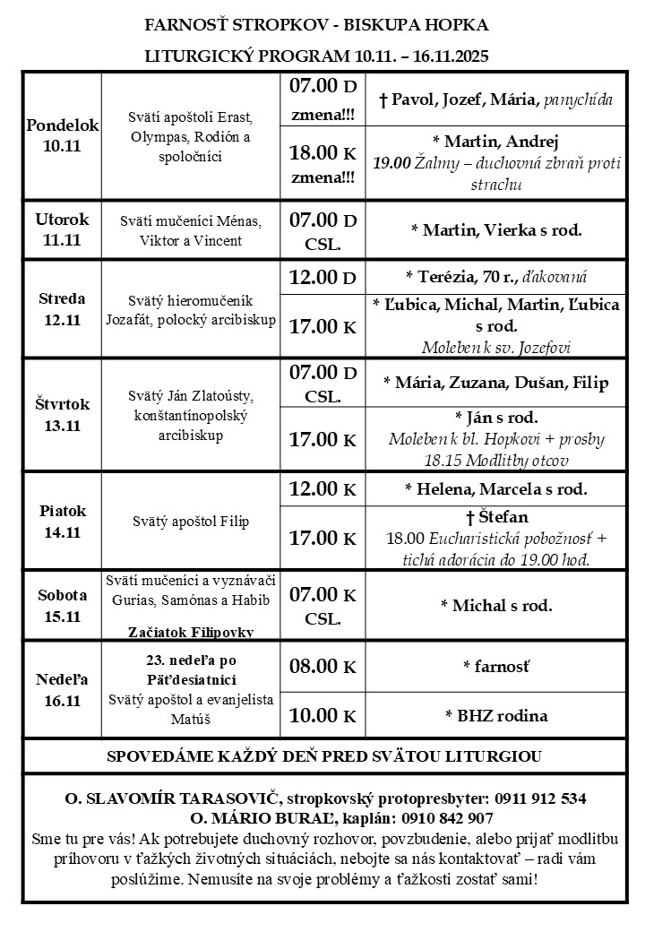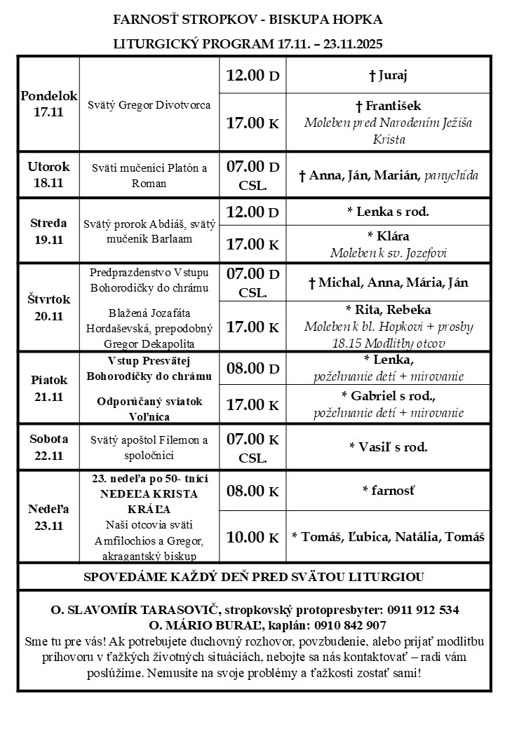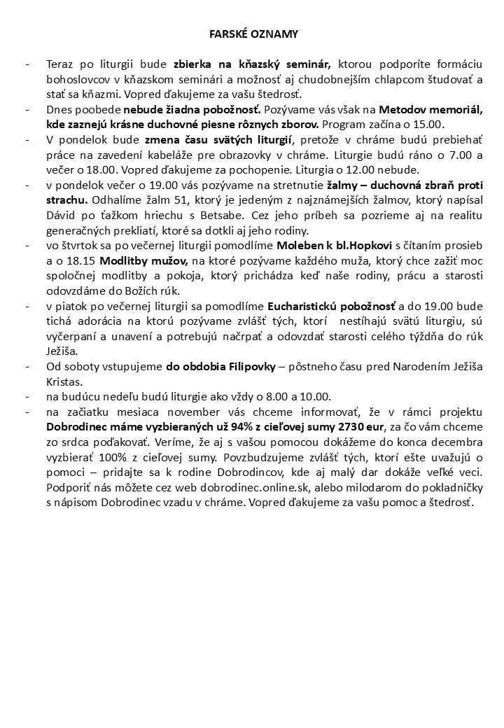 Nedeľa, 9.11.2025, liturgie budú o 8.00 a 10.00 hod. Po liturgiách bude zbierka na kňazský seminár. Tešíme sa na teba!