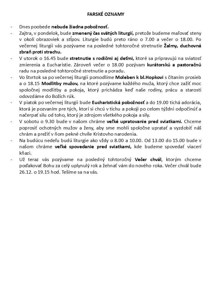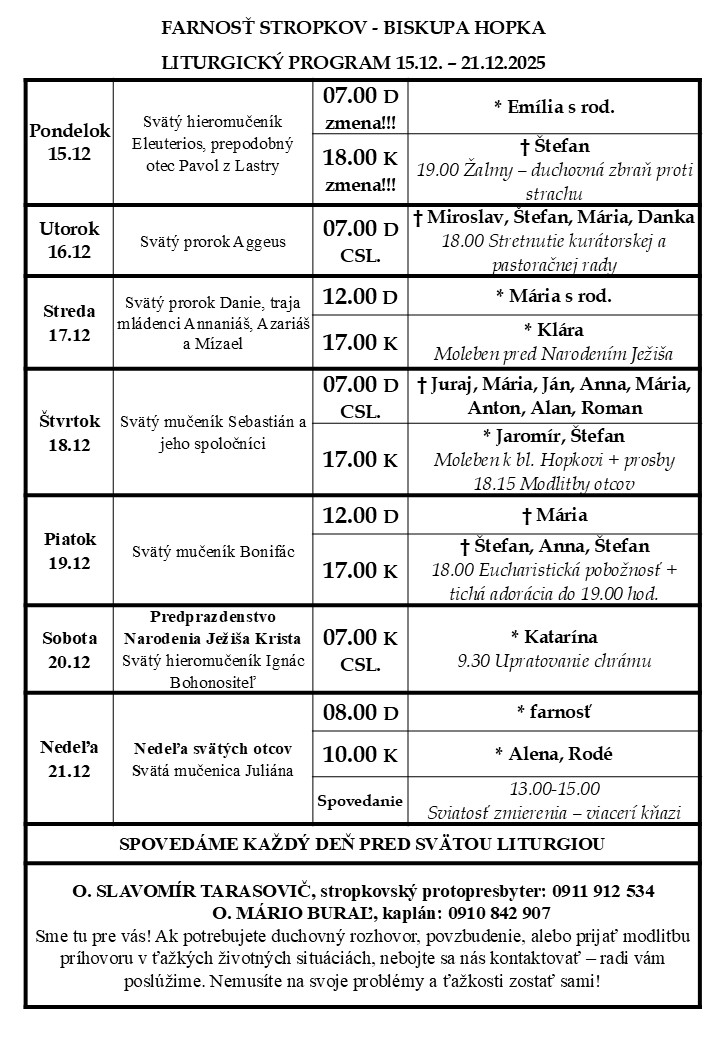 Nedeľa, 14.12.2025, liturgie budú o 8.00 a 10.00 hod. Tešíme sa na vás!