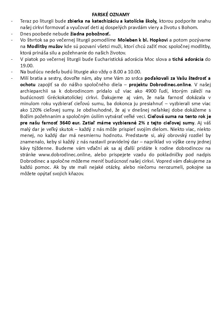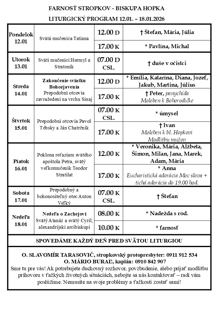 nedeľa, 11.1.2026, liturgie budú o 8.00 a 10.00 hod. Po liturgiách bude zbierka na katechizáciu a katolícke školy. Tešíme sa na teba!