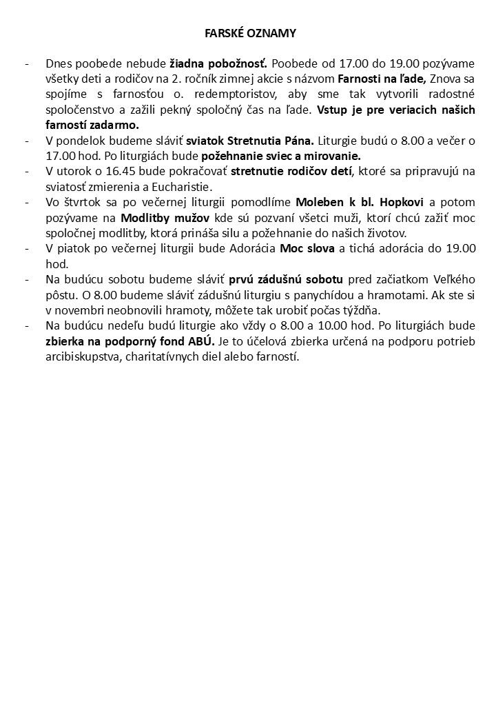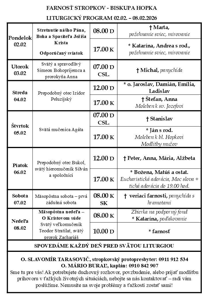 01.02.2026, nedeľa, liturgie budú o 8.00 a 10.00 hod.