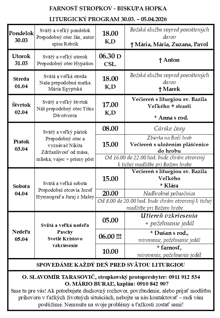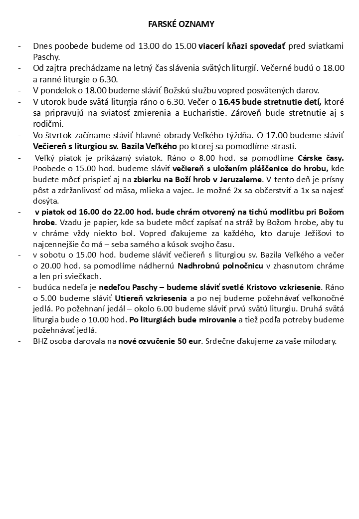 29.3.2026, liturgie o 8.00 a 10.00. Po liturgiách budeme požehnávať ratolesti a potom bude mirovanie. Tešíme sa na teba!